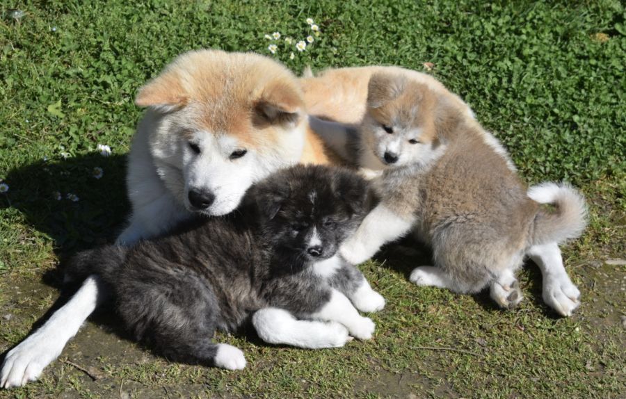 Les Akitas sont des chiens très calmes, notre chienne Stella est très sociable, douce et habituée aux jeunes enfants. Donc les chiots grandissent dans les même conditions familiales, avec le chat et les poules aux alentours.